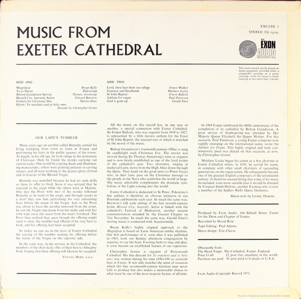 Side One 1. Magnificat - Brian Kelly 2. Tu es Petrus - Palestrina 3. Bishop Grandisson Service - Thomas Armstrong 4. Blessed City - Banks 5. Fanfare for Christmas Day - Martin Shaw 6. Hymn: Ye Watchers and Ye Holy Ones - descant by Christopher Gower Side Two 1. Lord, Thou hast been our Refuge - Ernest Walker 2. Fantasia and Sarabande - Matthew Locke 3. St John Baptist - Ernest Bullock 4. Jubilate for Organ - Patterson 5. God Rest ye Merry, Gentlemen - trad. 6. God is Gone Up - Gerald Finzi