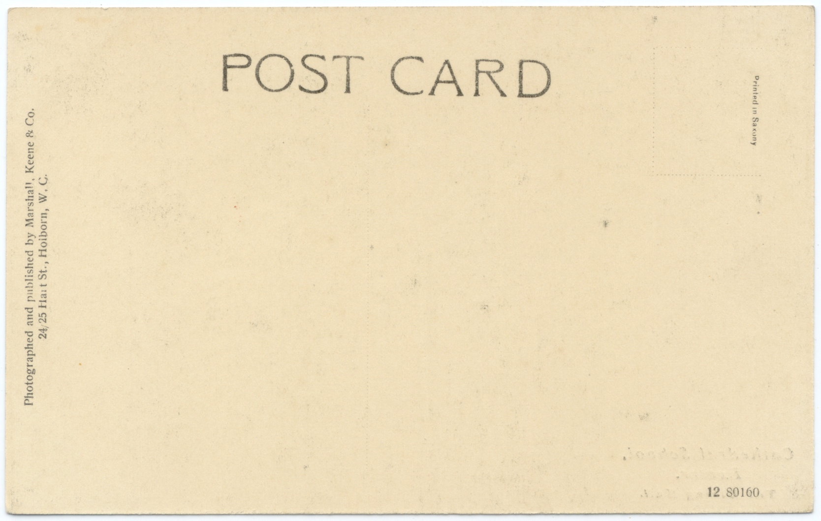 Details on the back of each card indicate that the photographs were taken by Marshall, Keene & Co., 24-25 Hart Street, Holborn, London. They were printed in Saxony, Germany. Each has a unique serial number on the back, prefixed by the number 12 in bold. The prefix was the company's way of showing the date of production, which here was 1912. Without this prefix, establsihing such a close date for the cards would likely have been challenging.