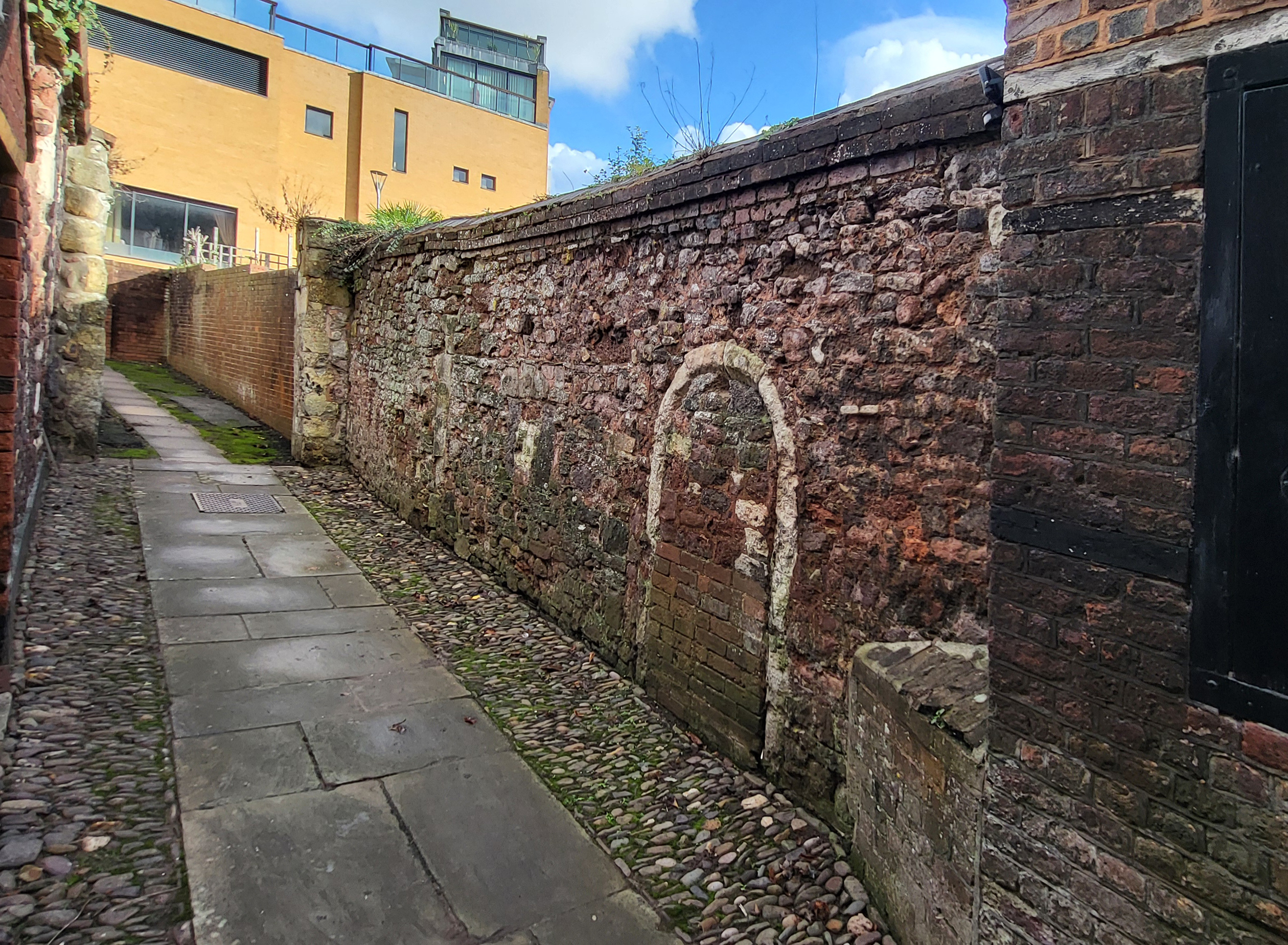 | The alley in 2025, looking in the opposite direction to the previous two photos, towards the former school entrance, with the narrower-paved post-War continuation to the street beyond it. A wall down the side of the old school area is on the right, with a much older, blocked arched doorway visible within it. | |