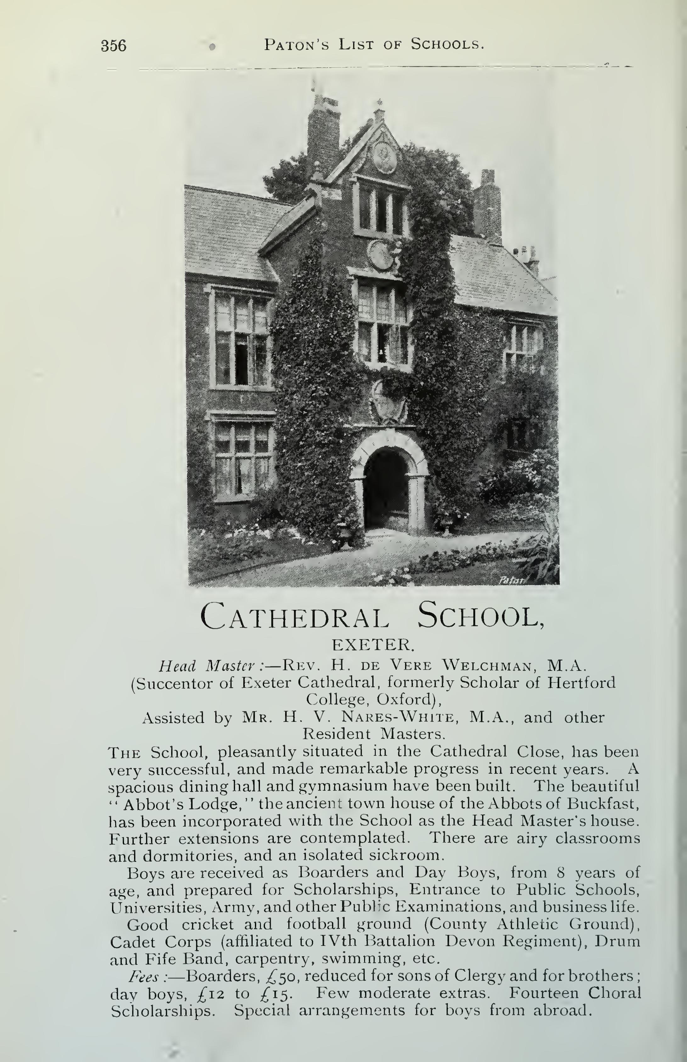 Assisted by Mr. H.V. Nares-White, M.A., and other Resident Masters.The School, pleasantly situated in the Cathedral Close, has been very successful, and made remarkable progress in recent years. A spacious dining hall and gymnasium have been built. The beautiful "Abbot's Lodge," the ancient town house of the Abbots of Buckfast, has been incorporated with the School as the Head Master's house. Further extensions are contemplated. There are airy classrooms and dormitories, and an isolated sickroom.