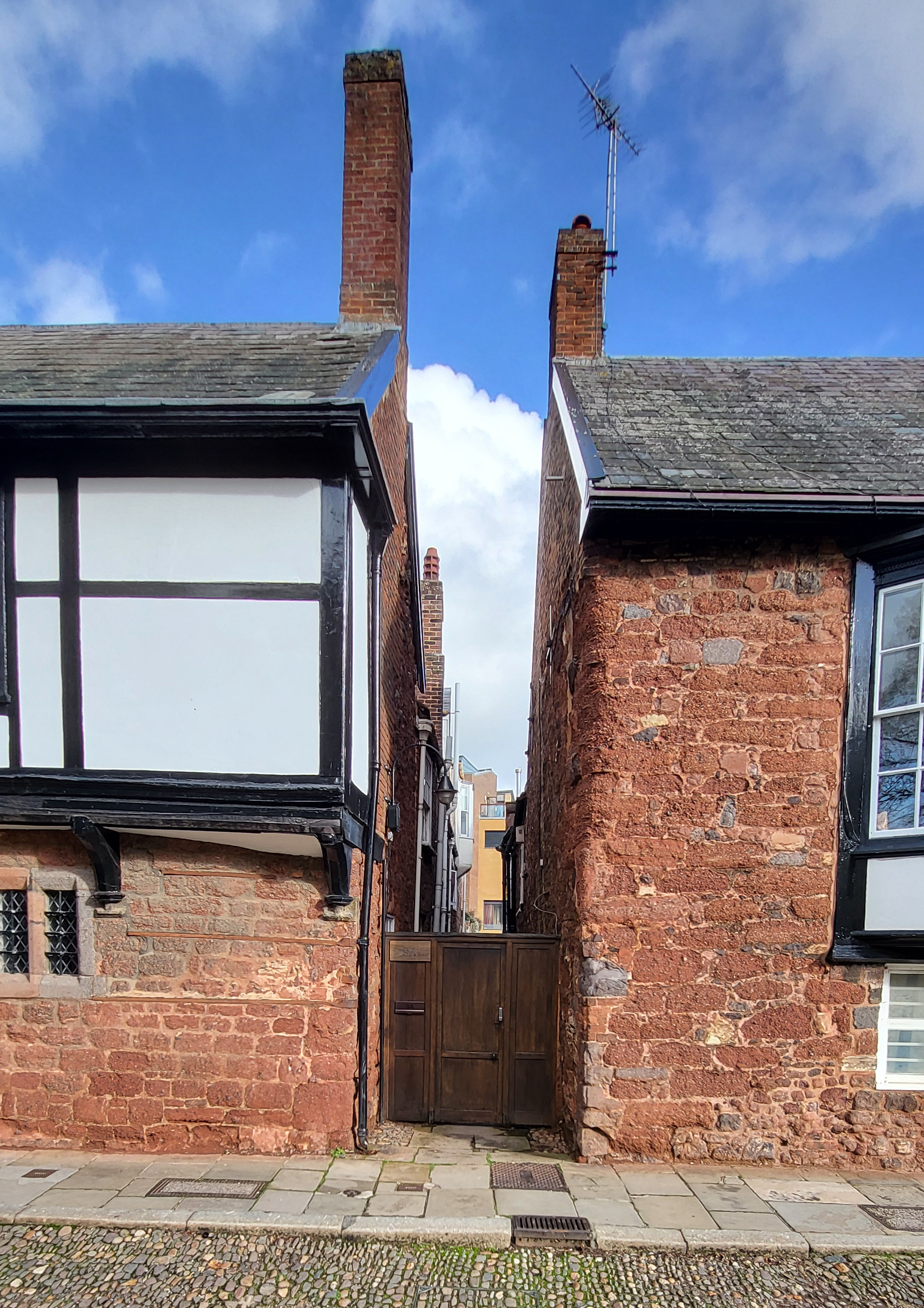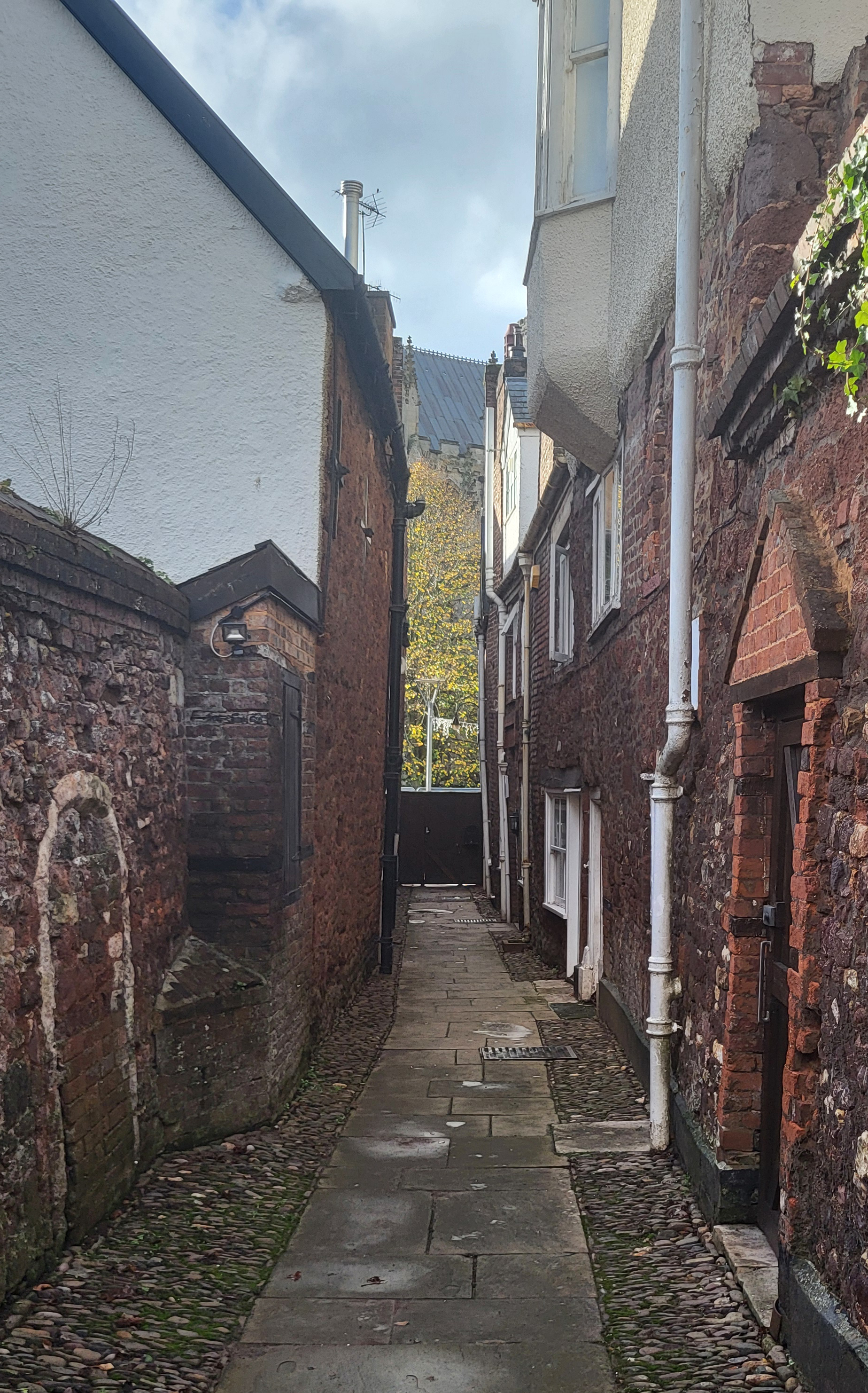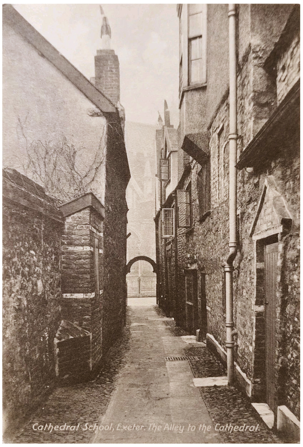 The Alley to the Cathedral Currently called 'Chorister Alley'. Number 9 The Close is on the right-hand end of the alley. Number 10, the current Deanery, is on the left. The 1912 photographer has his back to the entrance that ended the lane at this point and led into the School area. A former chorister, Denis Vercoe, describes the alley and the entrance in his memoirs: "a dark alleyway, lighted by one gas holder; at the head of this lane a door that filled the lane, with a small inner door let into it, admitting us to the Choir School yard itself." The alley now continues to the small street that runs behind the houses of the Close, formerly called Chapel Lane, or Little Egypt). |
