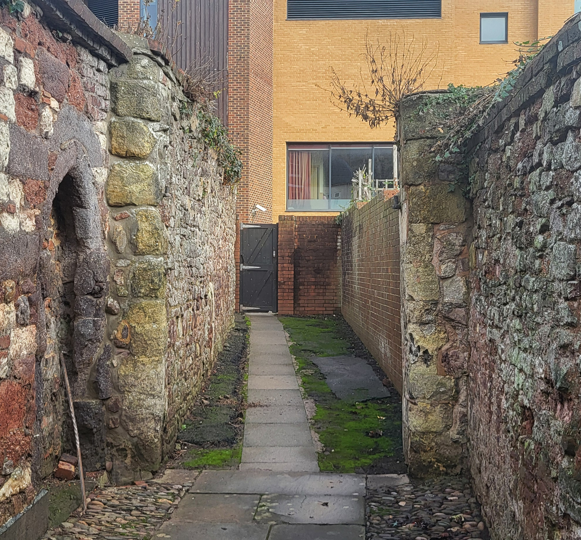 | The alley in 2025, looking in the opposite direction to the previous two photos, towards the former school entrance, with the narrower-paved post-War continuation to the street beyond it. A wall down the side of the old school area is on the right, with a much older, blocked arched doorway visible within it. | |
