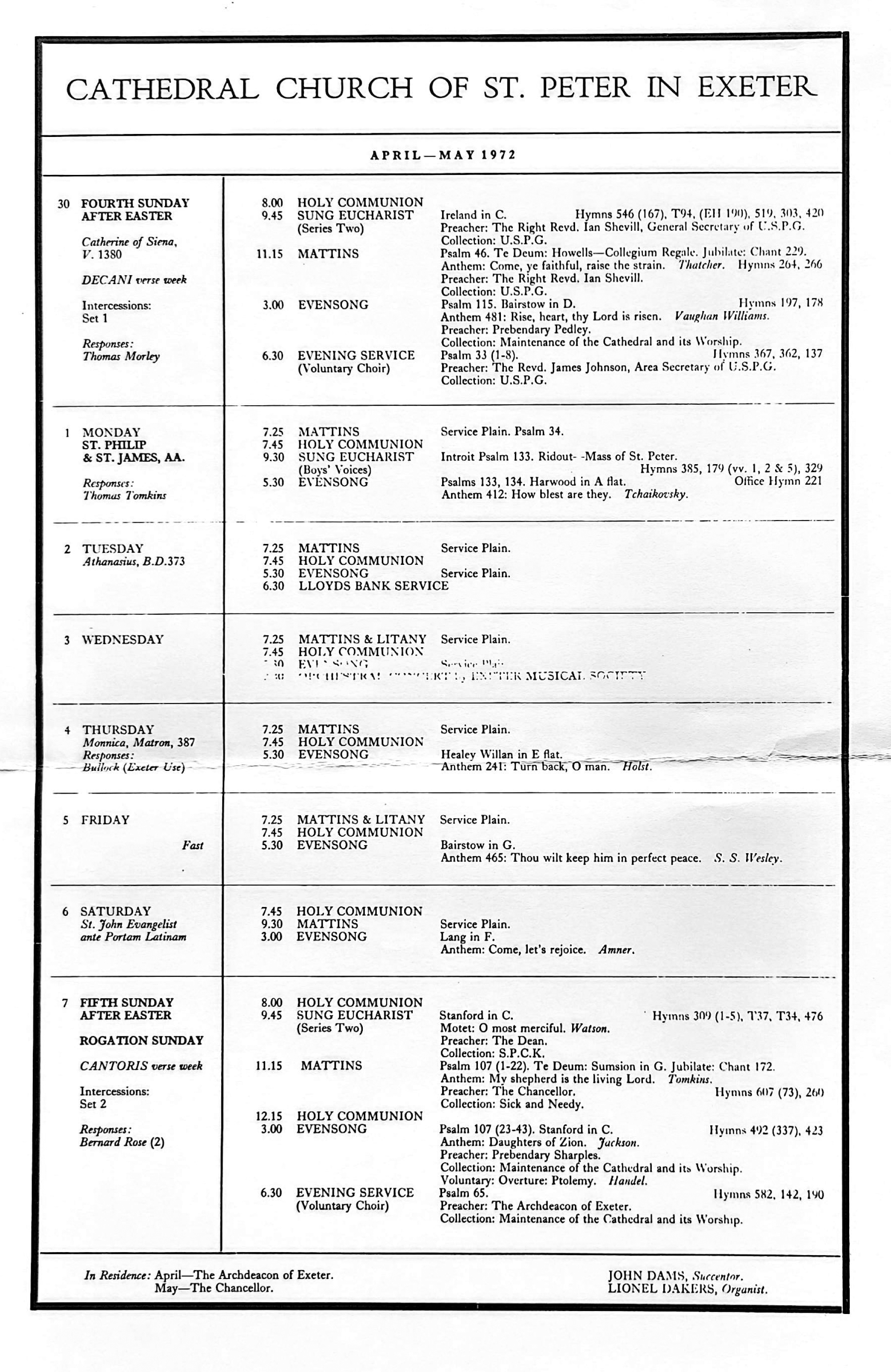 Service and Music list. April 30th-May 7th, 1972